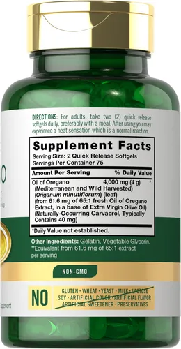 Cada capsula blanda contiene el equivalente a 2.000 mg de orégano fresco. Son de liberación rápida, de fuerza extra y están libres de GMO.