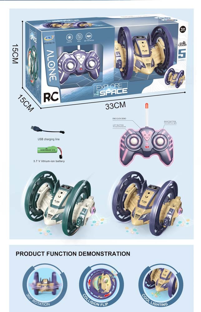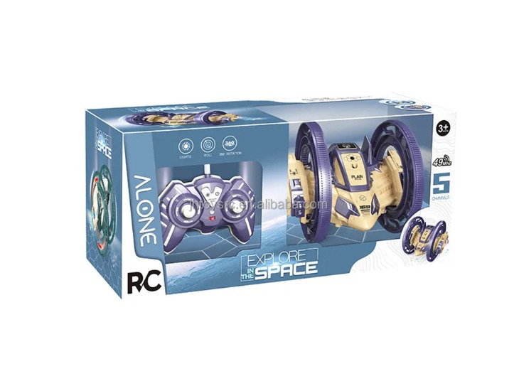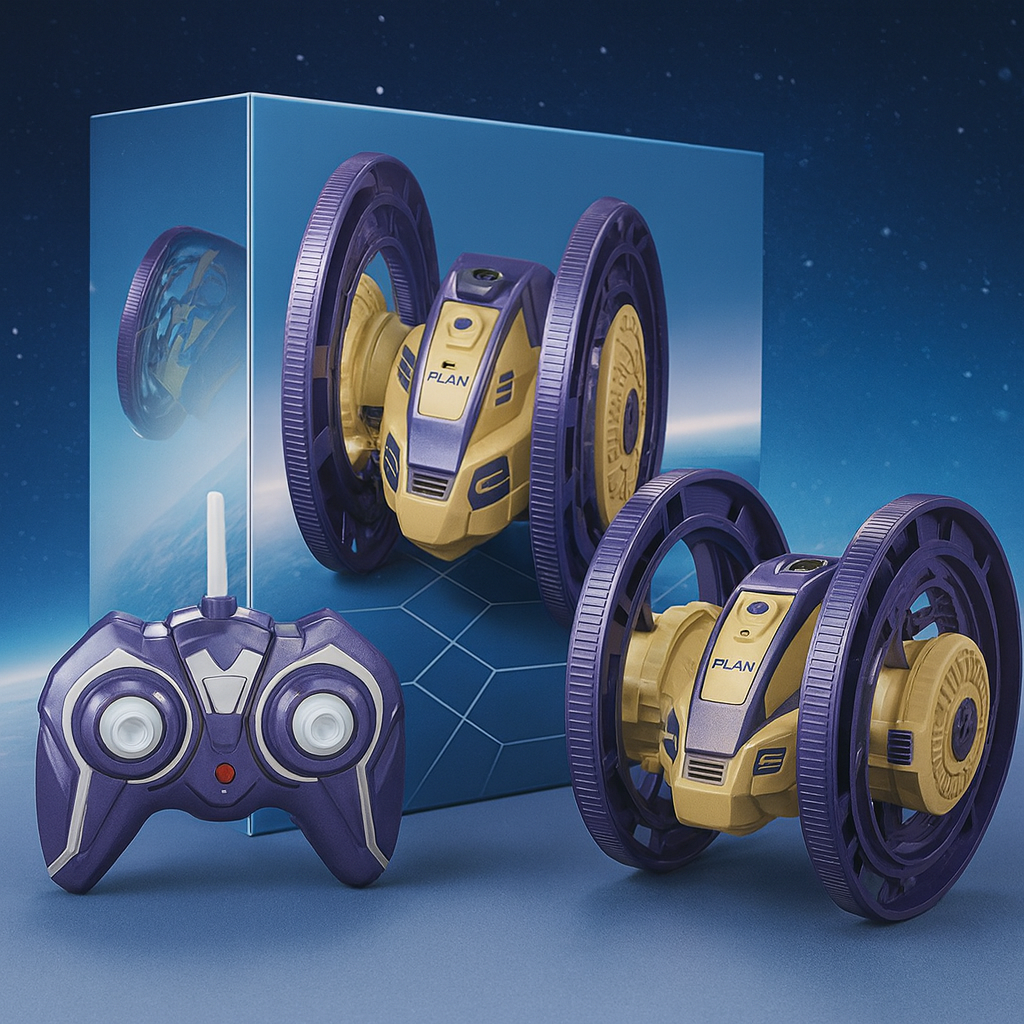 Carro a control remoto tipo stunt car/auto acrobático, con diseño futurista inspirado en exploración espacial. Es un juguete dinámico pensado para ofrecer movimientos llamativos, giros y maniobras que lo hacen muy entretenido para niños. Viene con control inalámbrico de estilo gamer para manejarlo con comodidad.