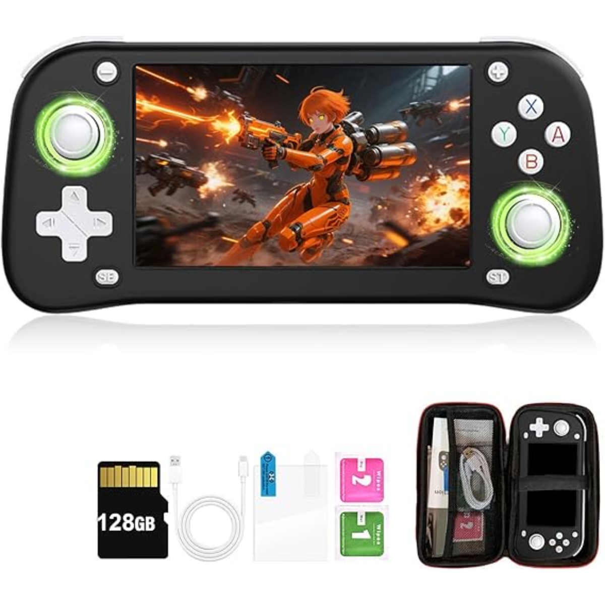 Amplia biblioteca de juegos y soporte de más de 30 emuladores: viene precargado con más de 25,000 juegos (128 GB) en una tarjeta TF, compatible con más de 30 emuladores para consolas clásicas como NES, SNES y GBA. El sistema Linux permite una fácil instalación de nuevos emuladores y juegos compatibles, además de dos ranuras para tarjetas TF (hasta 256 GB de expansión) para una variedad de juegos ilimitada.