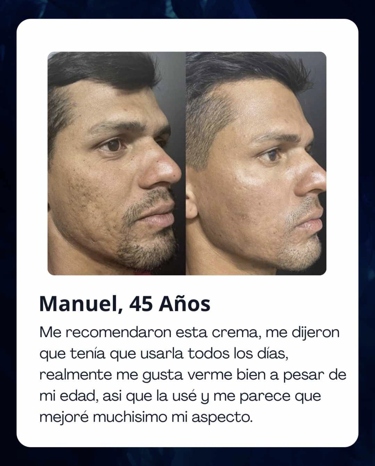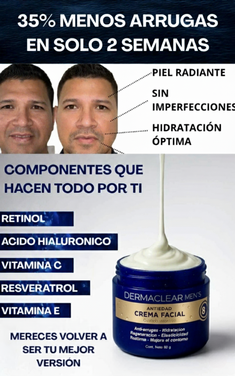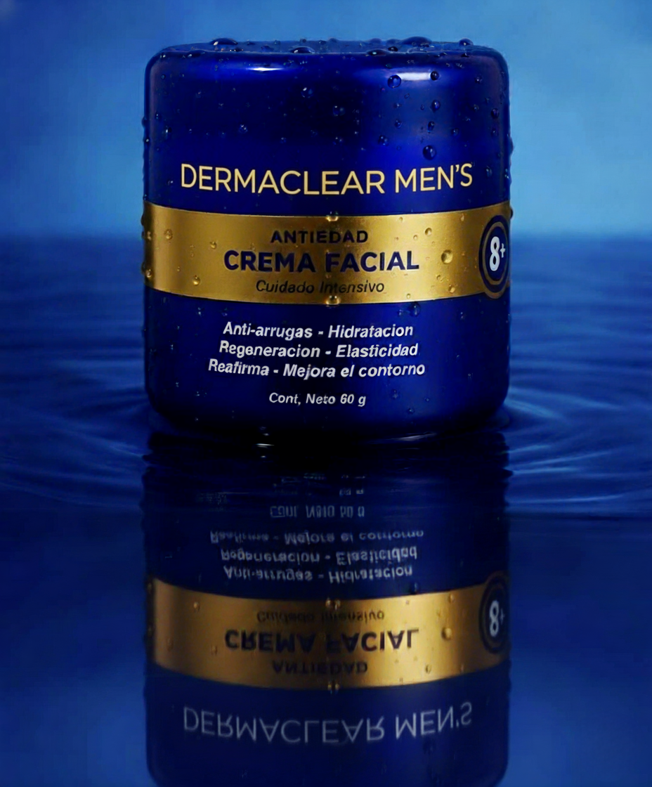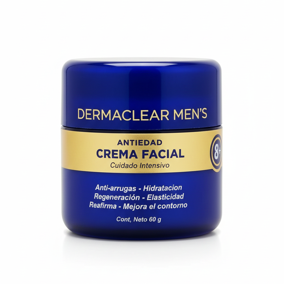 La crema facial DermaClear Men's Antiedad es el cuidado intensivo que la piel del hombre necesita. Formulada para combatir múltiples signos del envejecimiento y las imperfecciones, esta crema de textura ligera y rápida absorción trabaja en 8 frentes para brindarte un rostro más joven, saludable y revitalizado. Es tu aliado esencial para una rutina de cuidado de la piel superior.