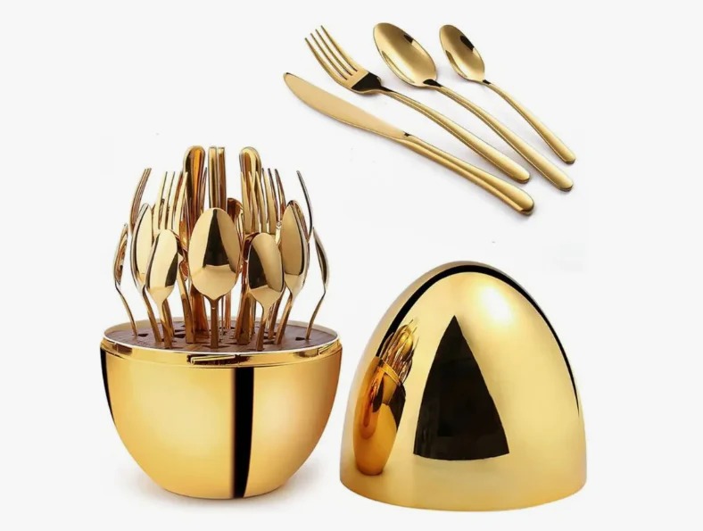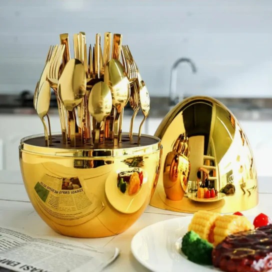 Forma elegante: nuestra caja de almacenamiento en forma de huevo y todos los cubiertos están hechos de acero inoxidable brillante de alta calidad, lujoso y duradero, en el medio hay un soporte con grano de madera de imitación, tiene la función de drenar el agua para garantizar la limpieza de la vajilla. Las formas únicas también se pueden utilizar para la exhibición artística.