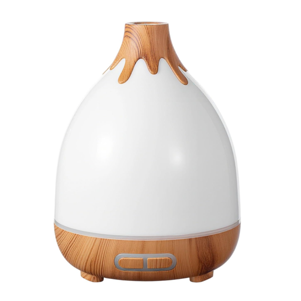 Forma tipo gota o pera, con acabado superior que simula una gota de madera derramada.