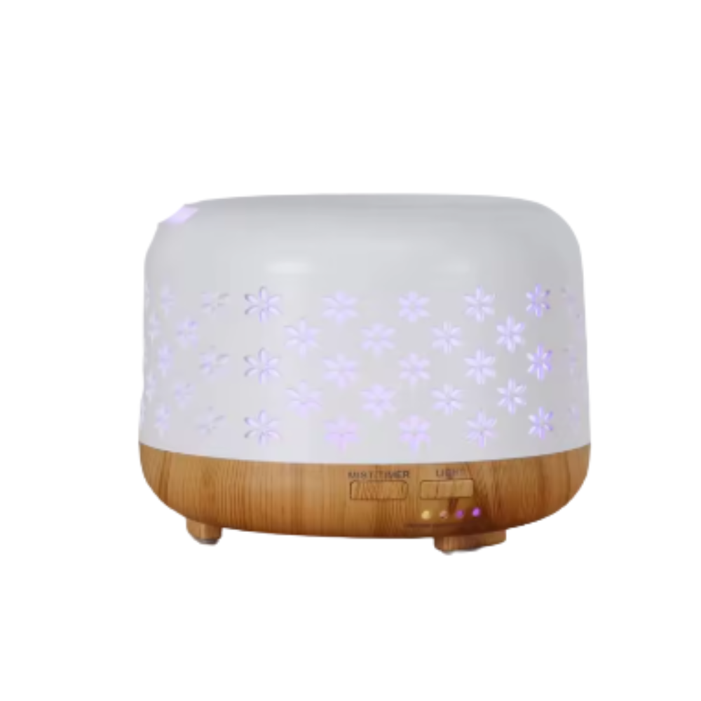 Su diseño moderno presenta una cúpula blanca con perforaciones en forma de flor, que al encenderse proyectan una suave iluminación, perfecta para usar como luz nocturna. La base cuenta con acabado tipo madera natural, aportando un estilo cálido y decorativo.