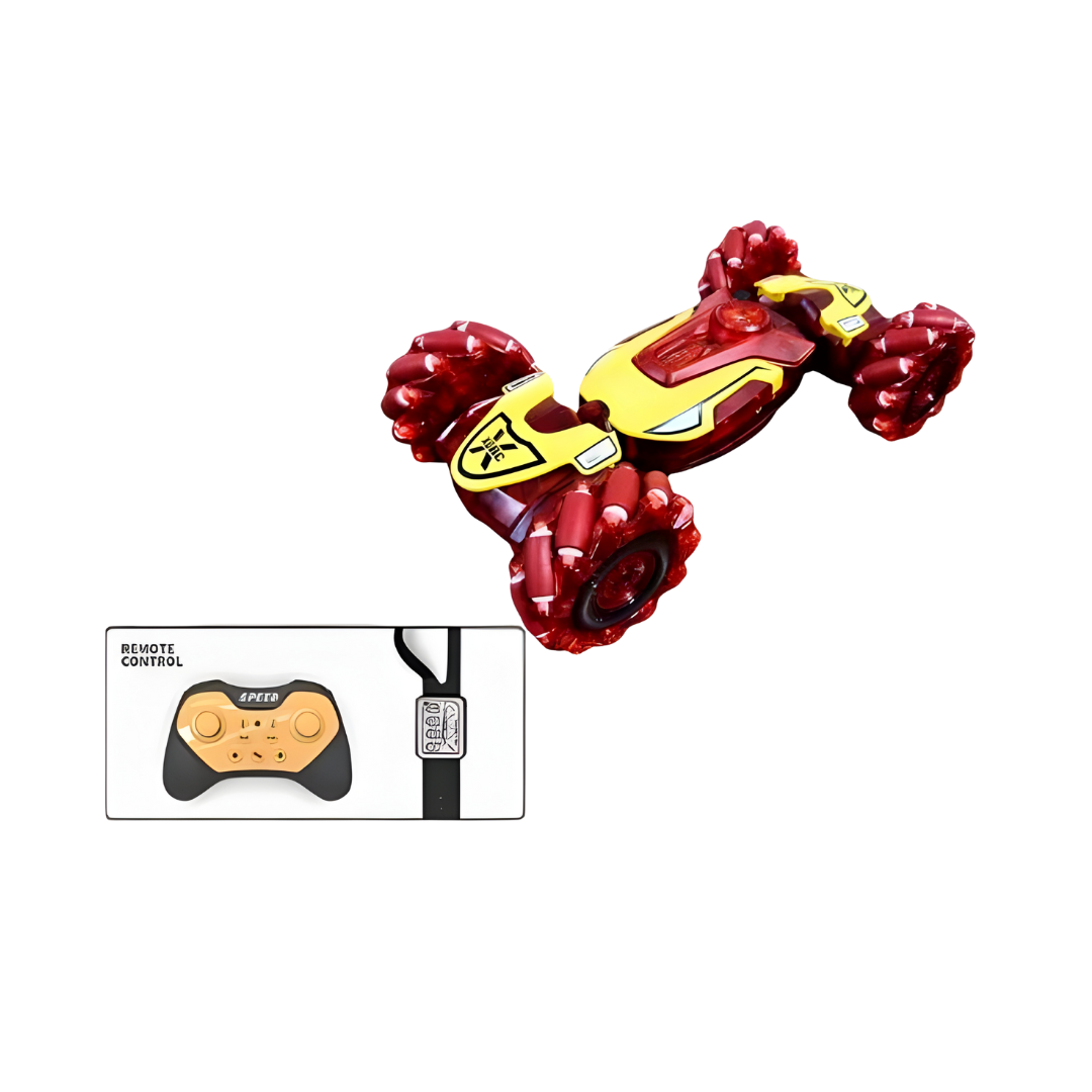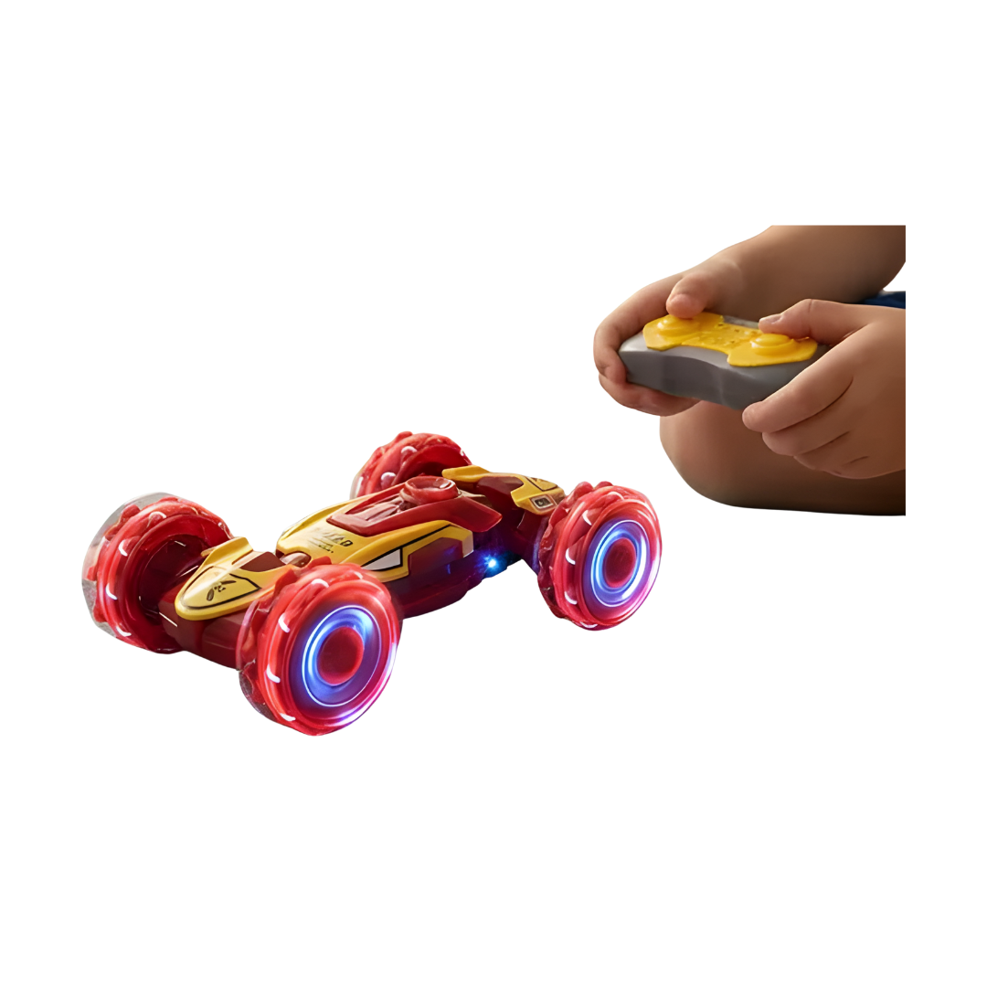 El vehículo puede ejecutar giros completos de 360°, derrapes controlados y cambios rápidos de orientación gracias a su centro de estabilidad ampliado. Las ruedas iluminadas generan efectos visuales durante las maniobras, haciendo que cada acrobacia resulte mas llamativa. El sistema RC de 2.4 GHz permite dirigirlo a distancia con buena respuesta y sin interferencias entre dispositivos cercanos.