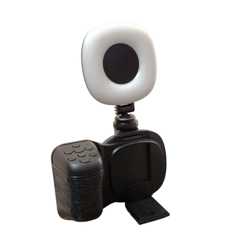 Se trata de un kit de accesorios para teléfonos inteligentes, que incluye un soporte de montaje y una luz LED para selfies.