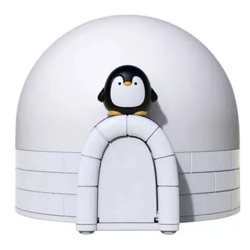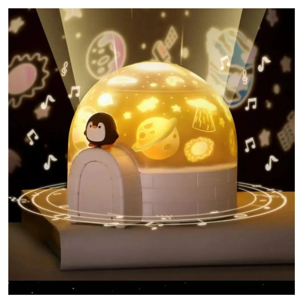 Este proyector infantil presenta un diseño inspirado en un iglú acompañado por una figura de pingüino, lo que lo convierte en un elemento decorativo atractivo y llamativo para espacios dedicados al descanso o la recreación. Su forma redondeada y apariencia amigable generan una sensación visual armoniosa, perfecta para crear ambientes suaves y relajantes.