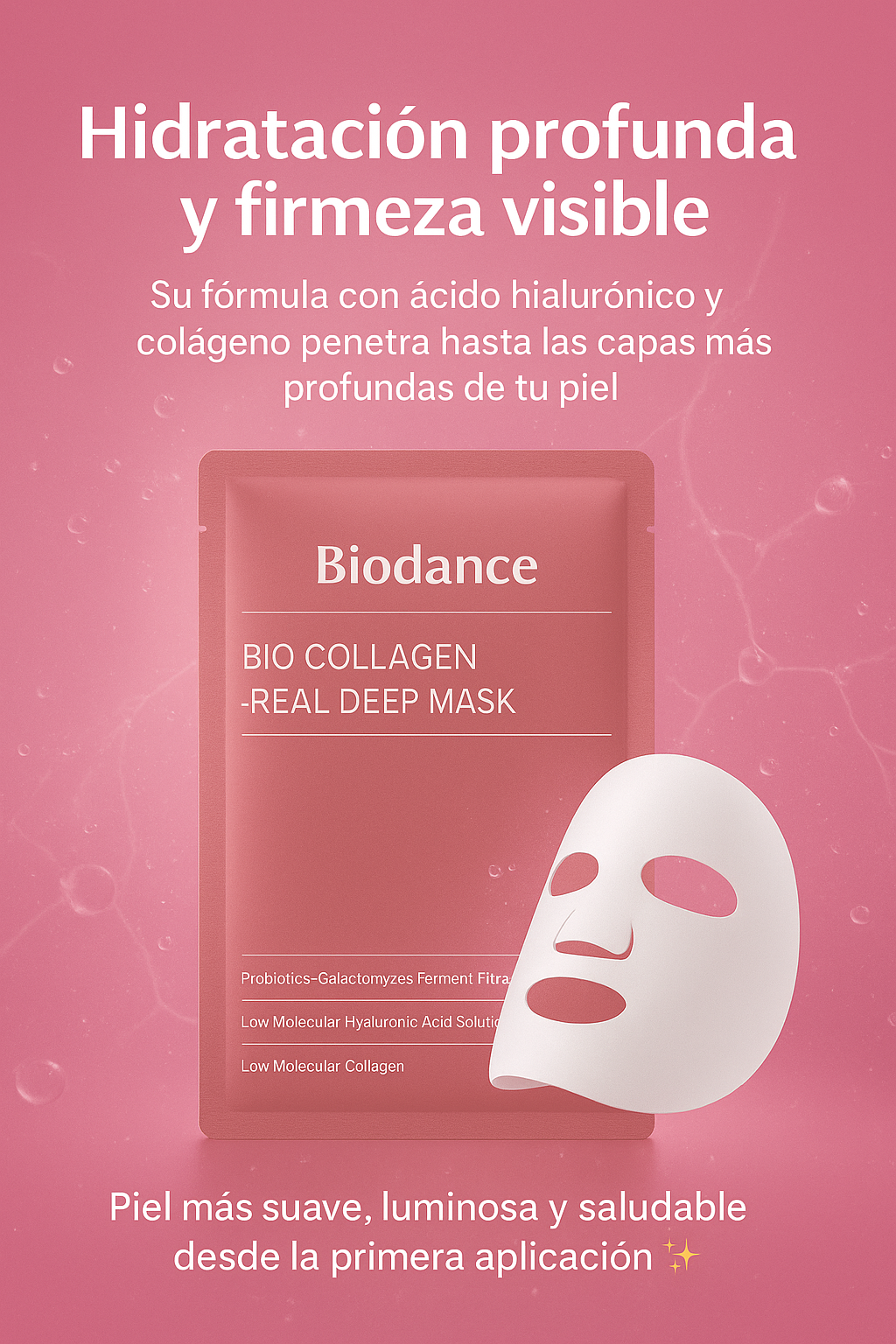 La Mascarilla Biodance hidrata y rejuvenece la piel al instante. Su fórmula con colágeno y ácido hialurónico mejora la elasticidad, aporta luminosidad y deja el rostro más firme, suave y con un glow natural. Perfecta para todo tipo de piel.