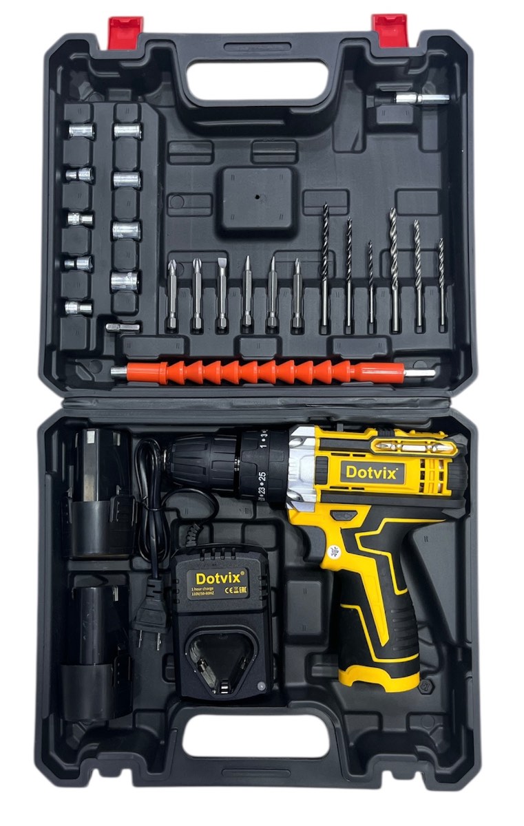La imagen muestra un taladro percutor atornillador inalámbrico de la marca Dotvix en un maletín con accesorios.