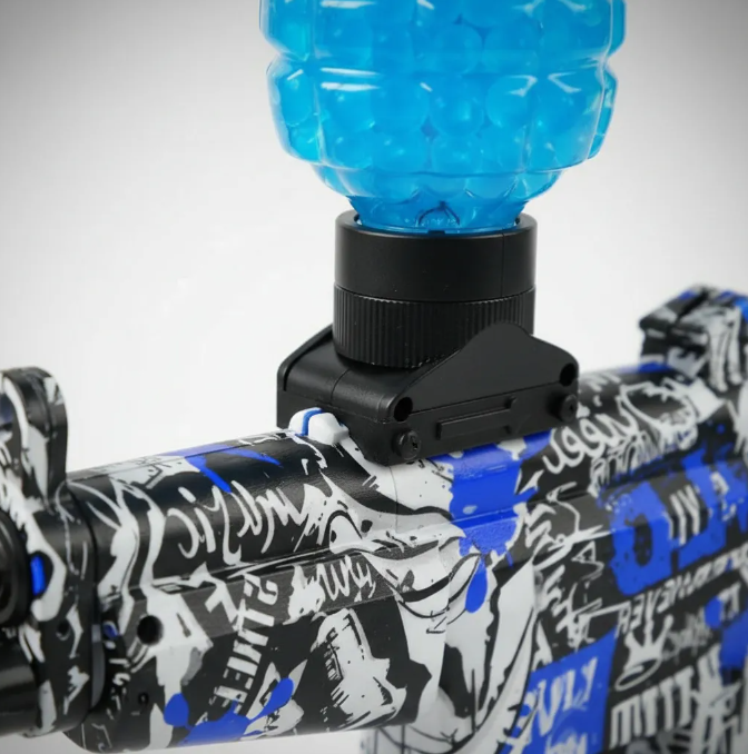 Pistola automática lanzabalines de gel con un diseño tipo graffiti en tonos negro, blanco y azul. Ideal para juegos al aire libre, ofreciendo disparos rápidos, seguros y divertidos. Su depósito superior permite ver las esferas hidratadas y recargar de forma sencilla.