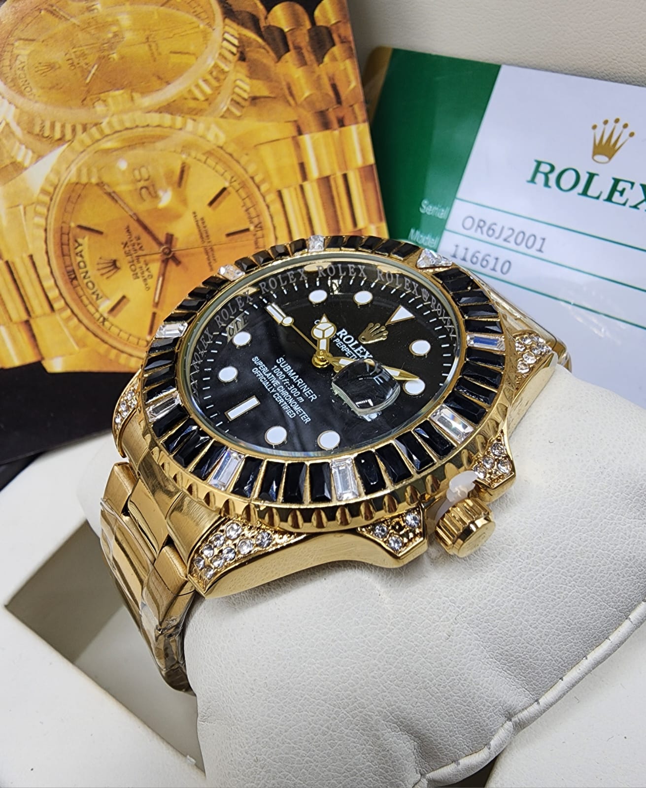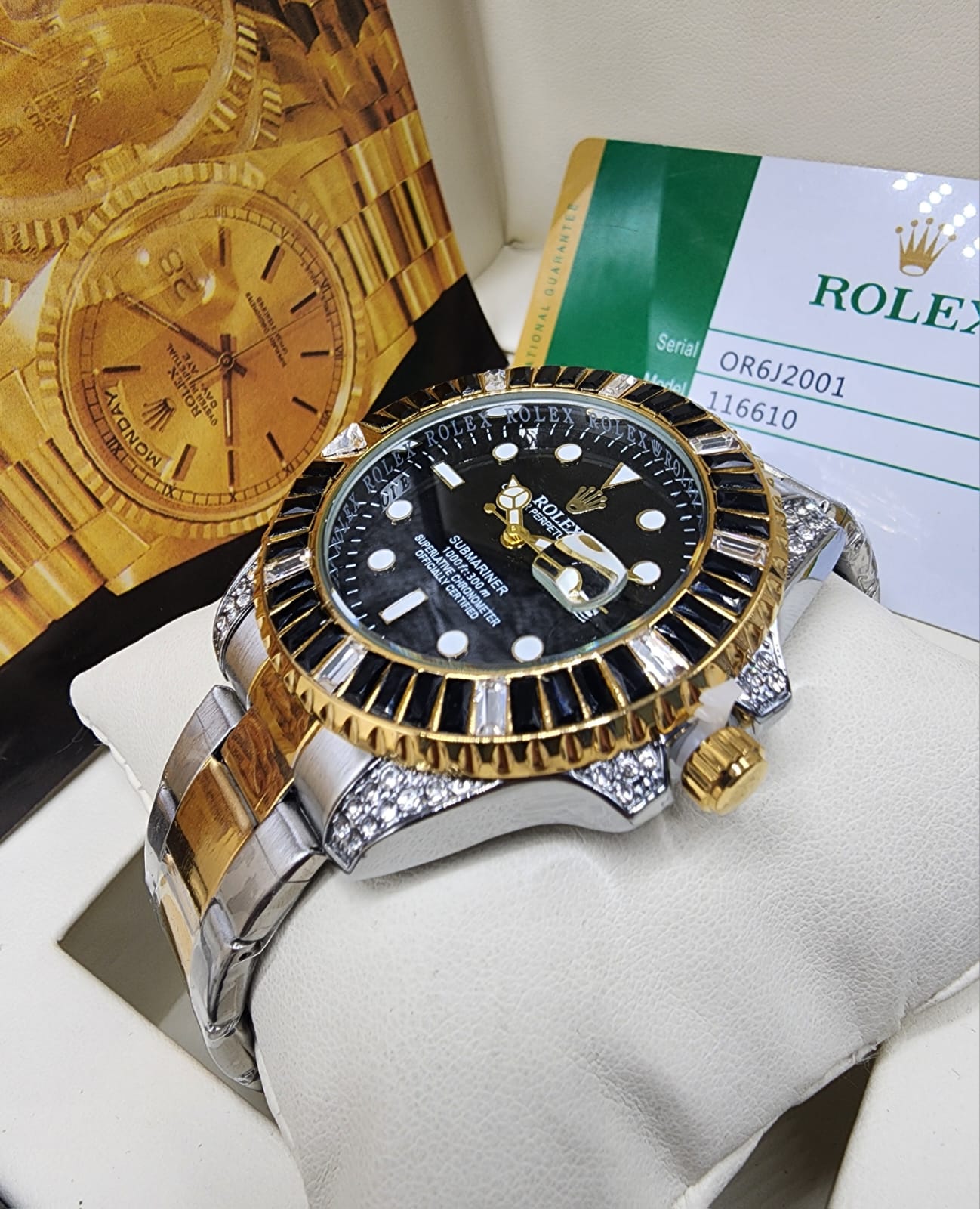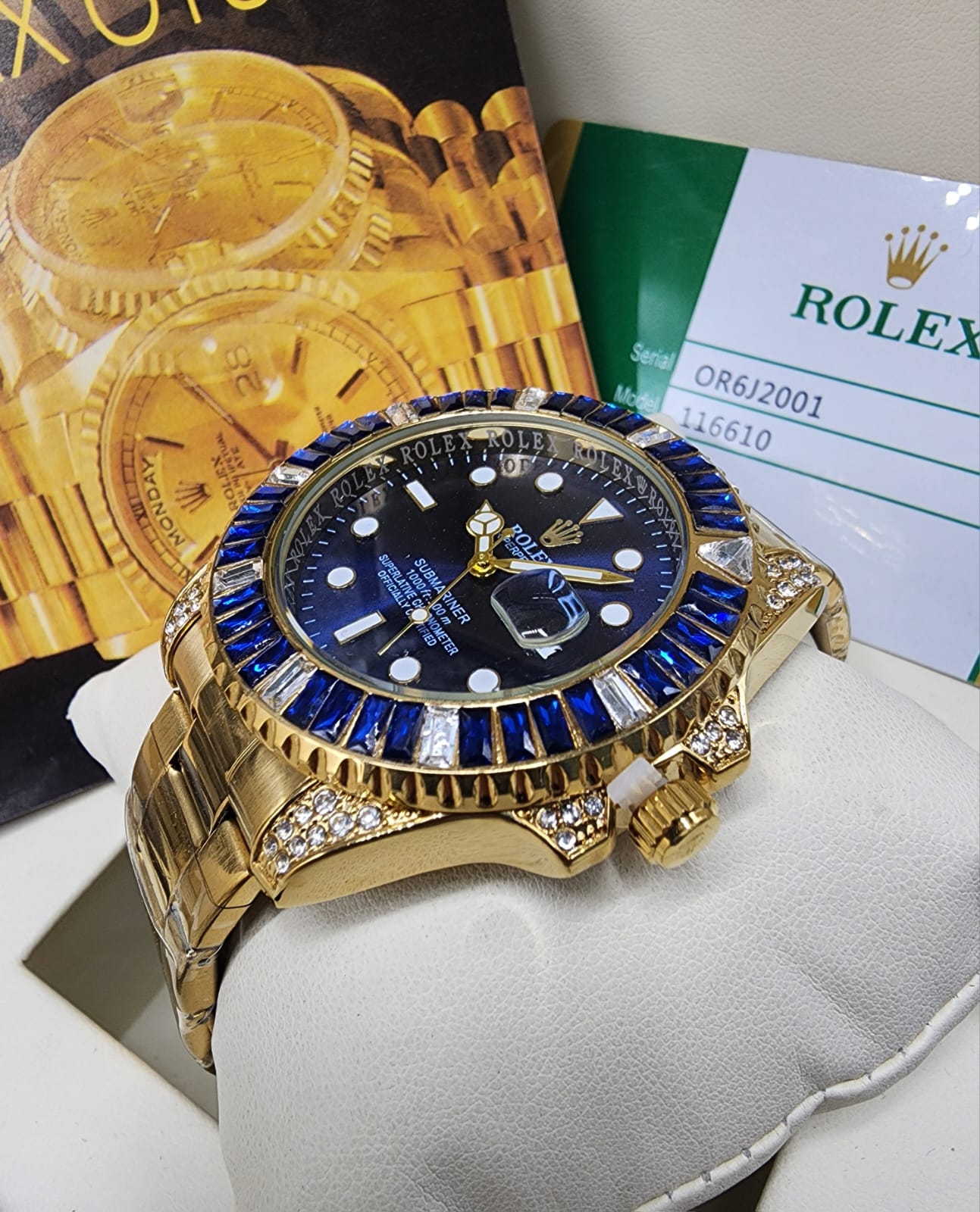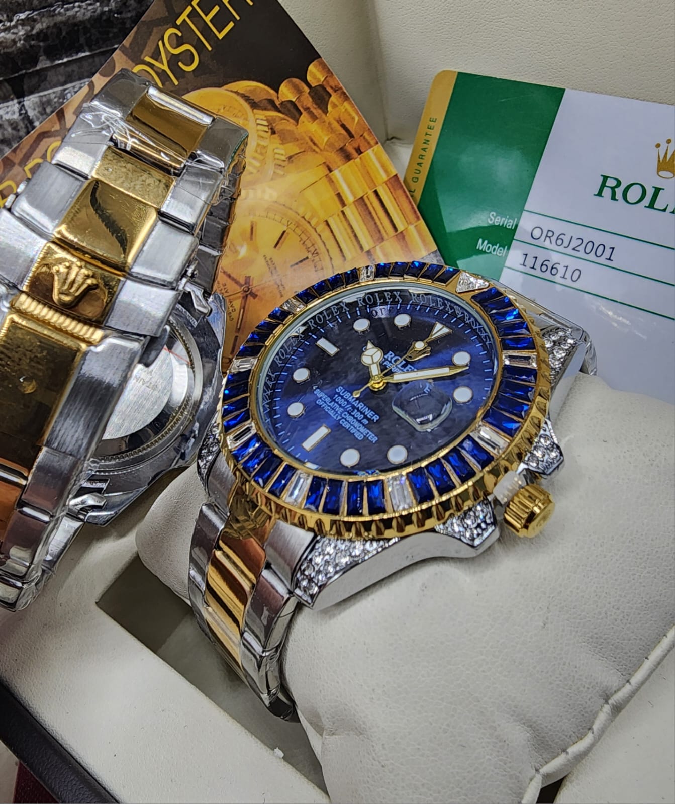 Reloj elegante y llamativo con diseño estilo Rolex e incrustaciones de brillantes.