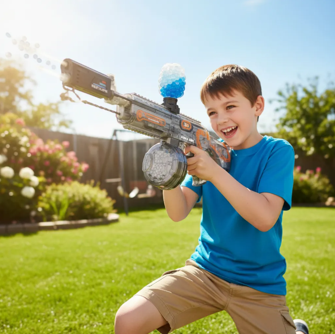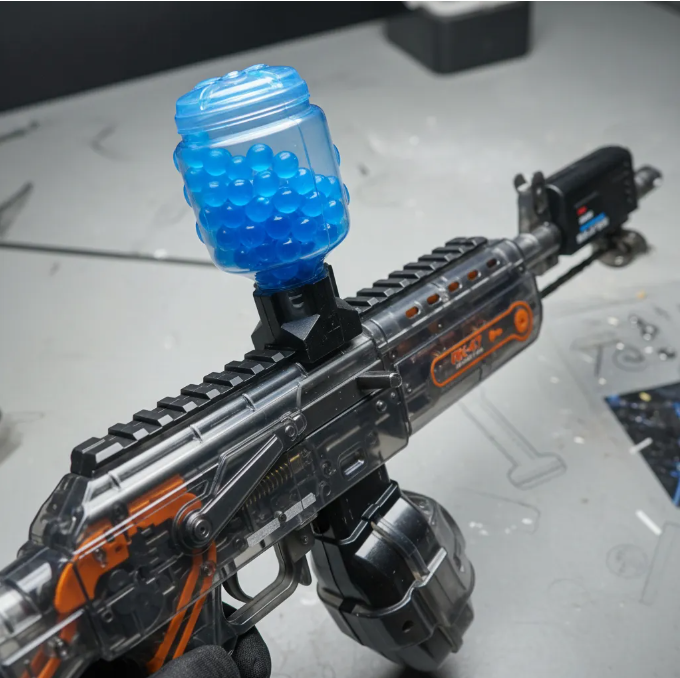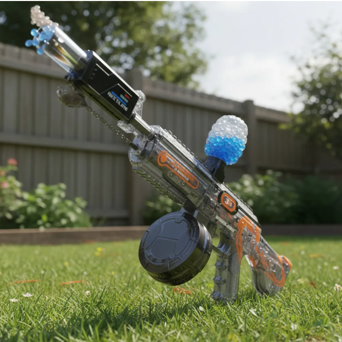 Rifle automático lanzabalines ideal para juegos al aire libre. Dispara balines de gel hidratables de bajo impacto, seguros y fáciles de limpiar. Su diseño transparente con detalles tácticos, cargador tipo tambor y depósito superior de alta capacidad permiten una experiencia más realista y divertida.