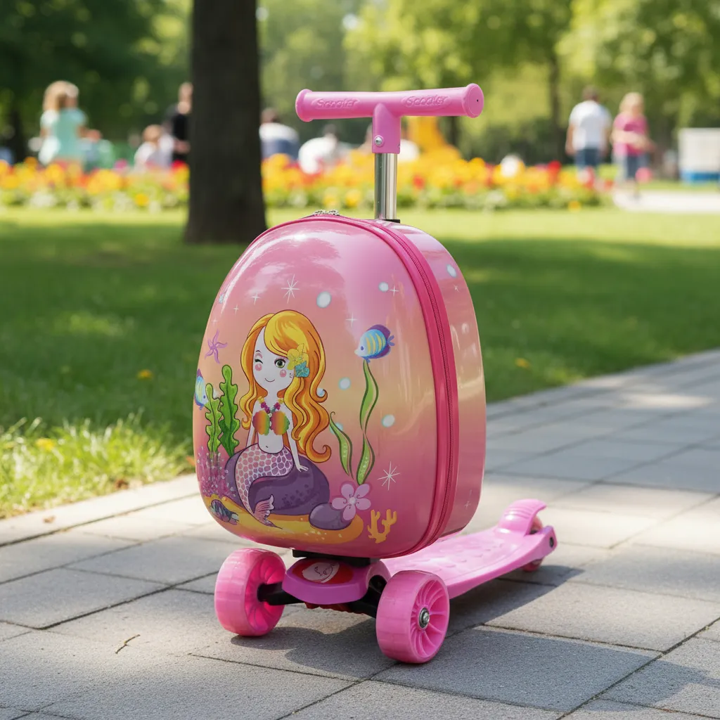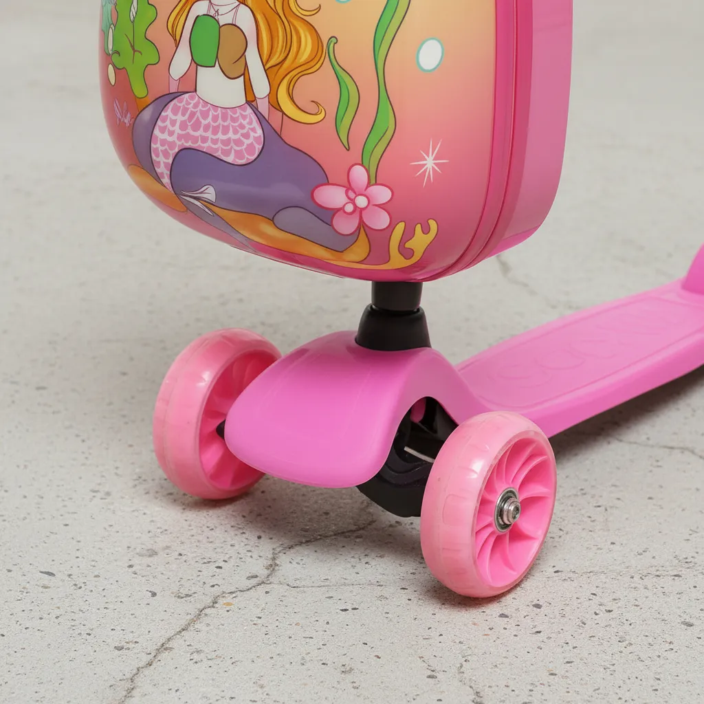 Con el Patinete Scooter Con Maleta De Dibujos Animados color rosa diseño de sirena y unicornio, color azul con diseño de perrito y el otro diseño es de carritos y por ultimo color amárico con diseño de jirafas, tus pequeños exploradores podrán disfrutar de un divertido viaje sobre ruedas. Este atractivo patinete, diseñado especialmente para niñas y niños de 3 a 4 años, combina un color rosa vibrante con un encantador diseño de gatitos, ideal para atraer la atención y despertar la imaginación de los más pequeños.