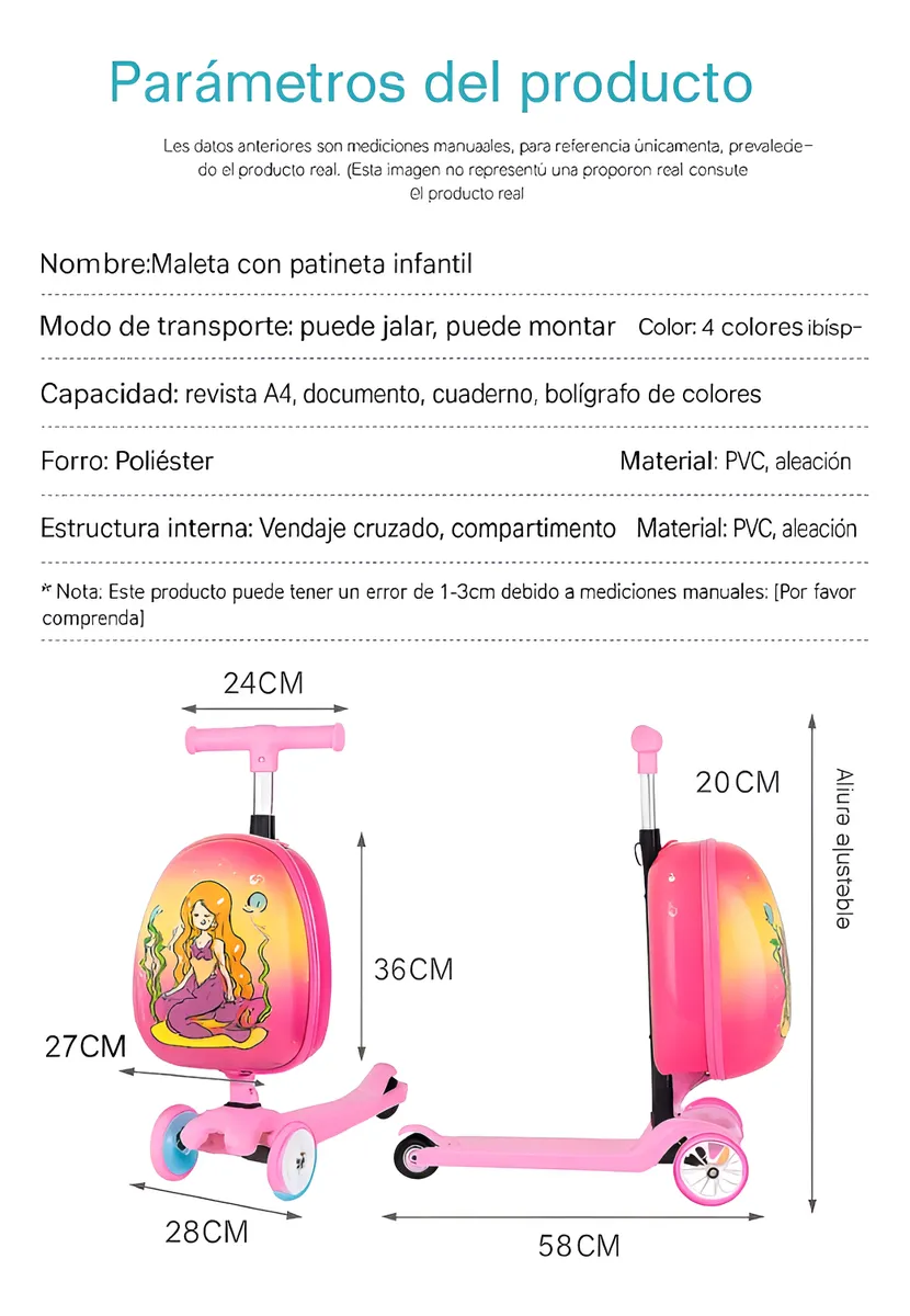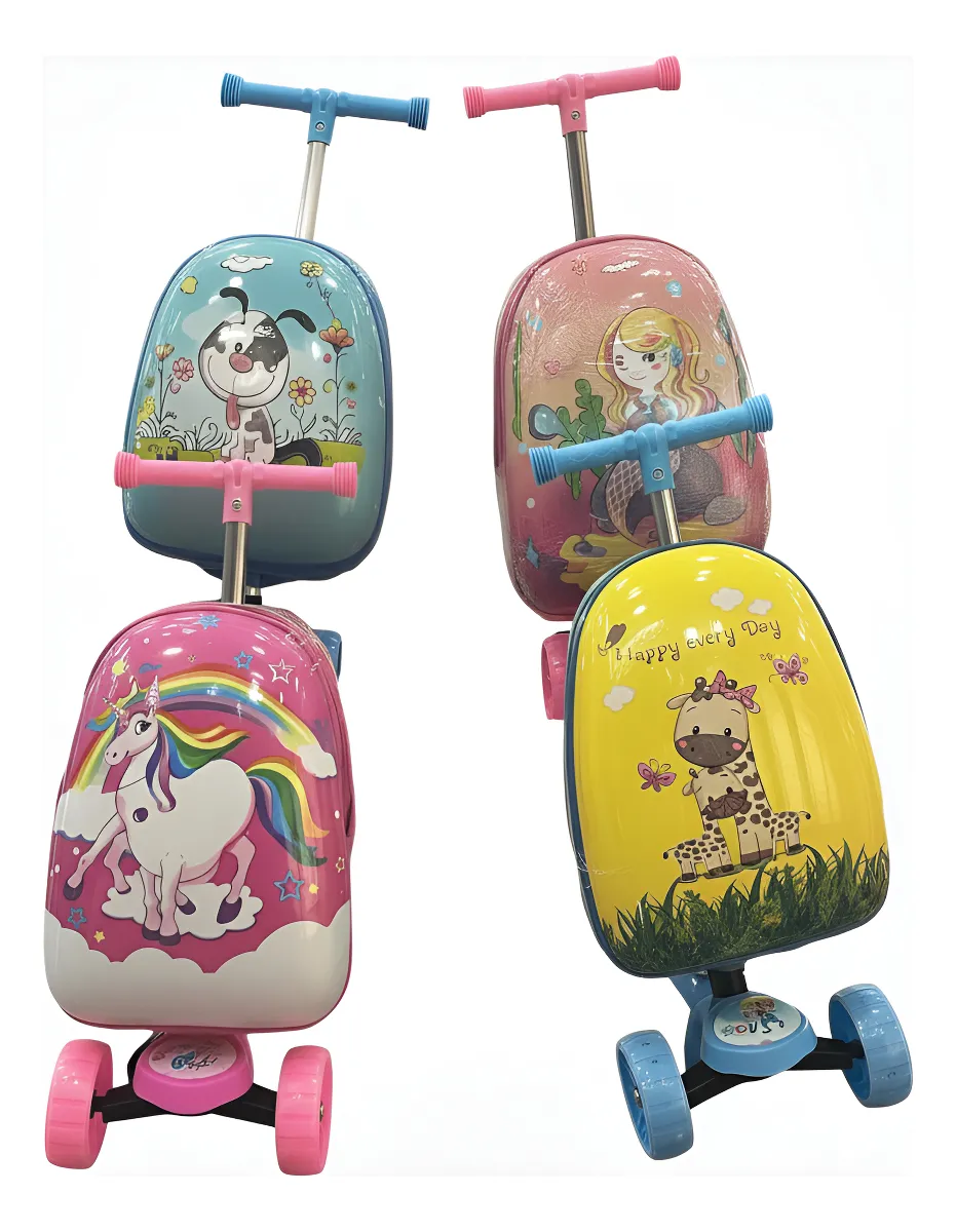 Con el Patinete Scooter Con Maleta De Dibujos Animados color rosa diseño de sirena y unicornio, color azul con diseño de perrito y el otro diseño es de carritos y por ultimo color amárico con diseño de jirafas, tus pequeños exploradores podrán disfrutar de un divertido viaje sobre ruedas. Este atractivo patinete, diseñado especialmente para niñas y niños de 3 a 4 años, combina un color rosa vibrante con un encantador diseño de gatitos, ideal para atraer la atención y despertar la imaginación de los más pequeños.