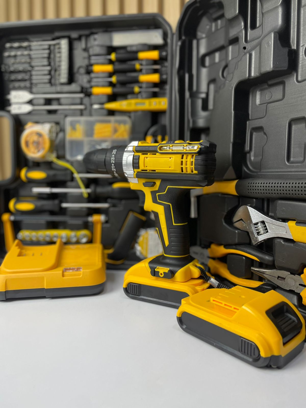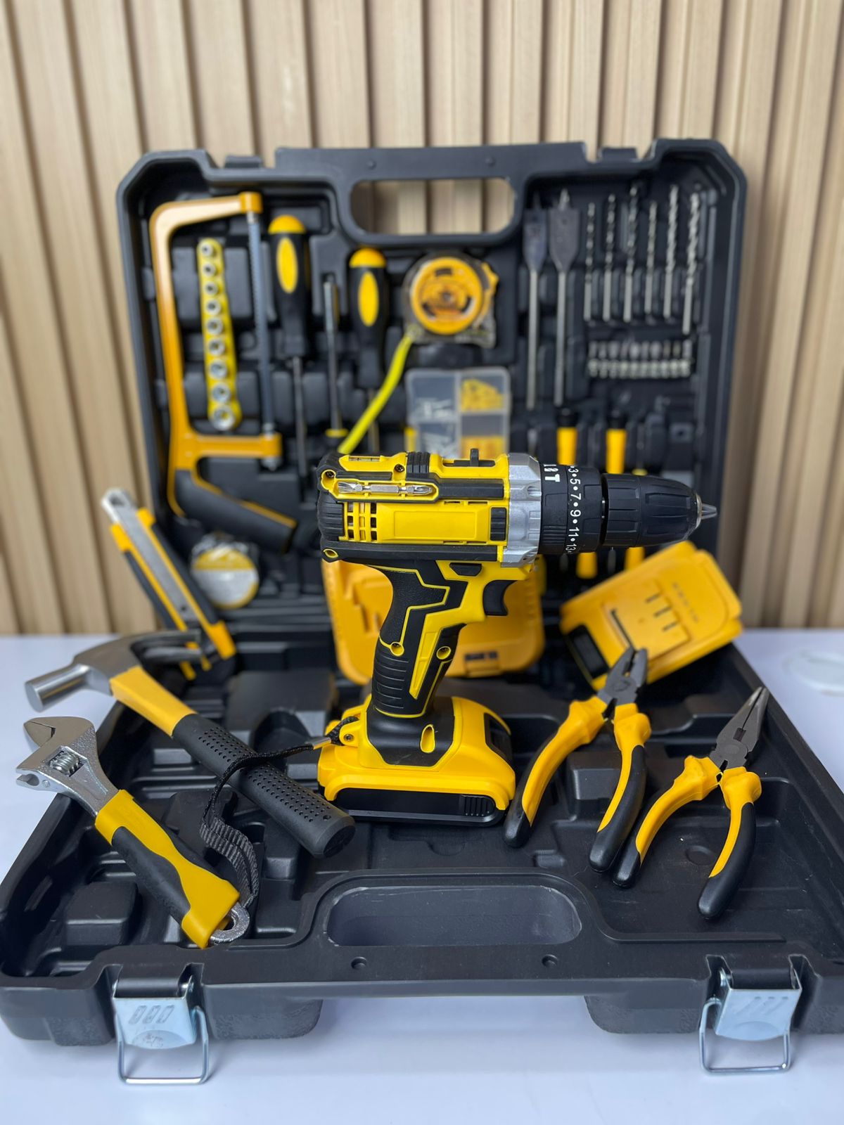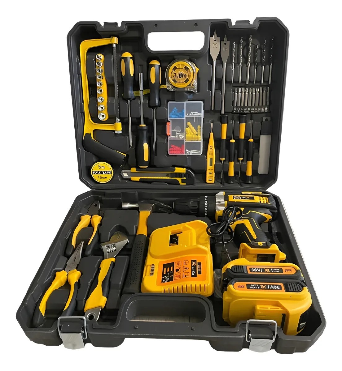 El kit de herramientas multifunción con taladro inalámbrico es un conjunto completo diseñado para trabajos domésticos, mantenimiento general y tareas de ensamblaje. Incluye un taladro atornillador inalámbrico, accesorios de perforación, herramientas manuales y elementos de fijación, todo organizado en un maletín rígido de alta resistencia. Su composición combina herramientas mecánicas, herramientas eléctricas y piezas auxiliares que permiten realizar operaciones de corte, atornillado, sujeción y medición.