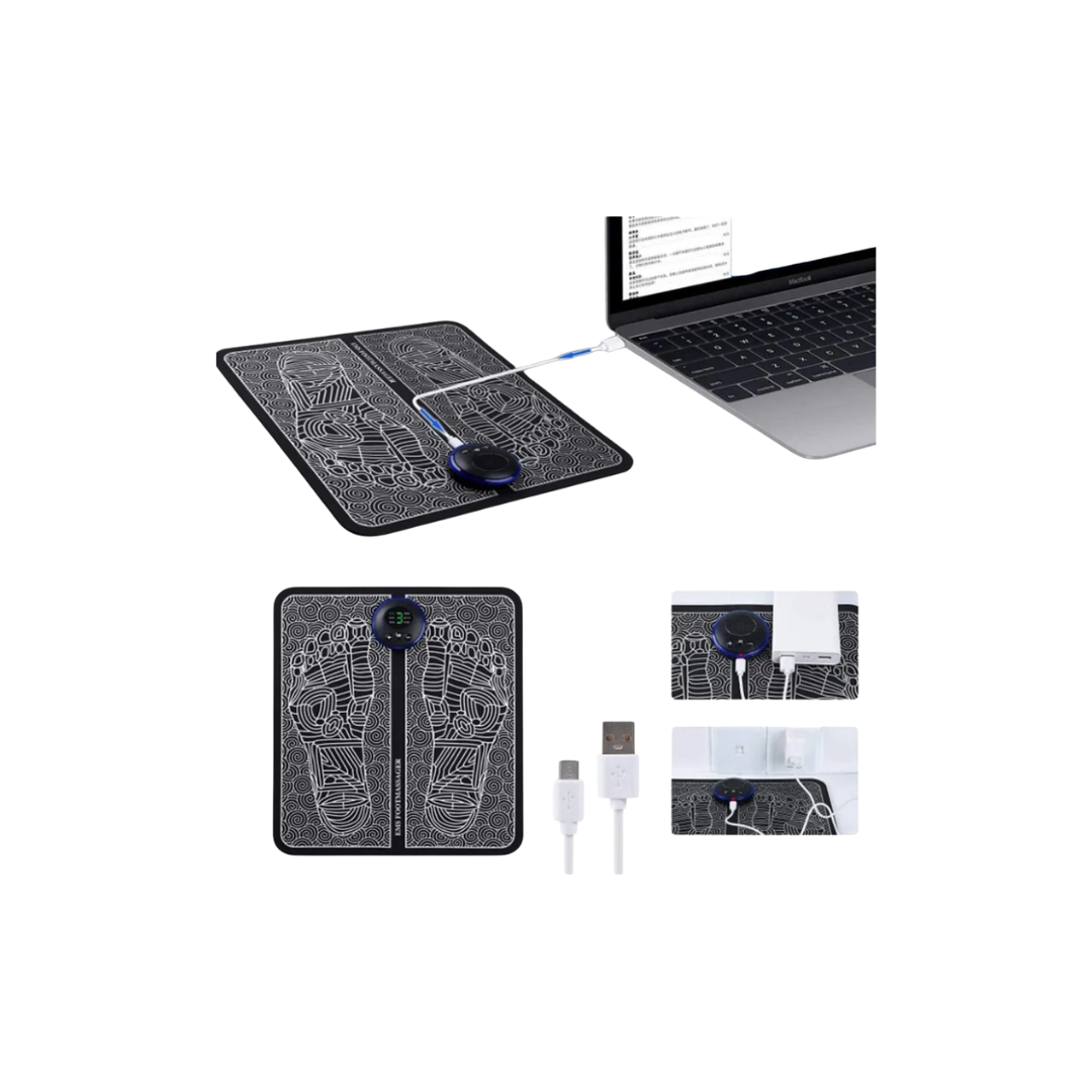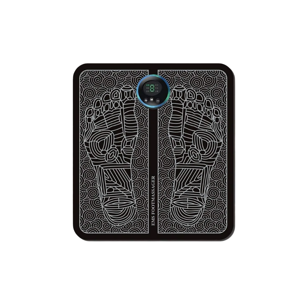 Tapete de electroestimulación diseñado para aplicar pulsos de baja intensidad en la planta de los pies, contribuyendo a la relajación muscular y al alivio del cansancio acumulado en piernas y pies. Su superficie está fabricada en material polímero flexible con circuitos de contacto integrados, permitiendo una distribución uniforme de los impulsos eléctricos durante el uso.