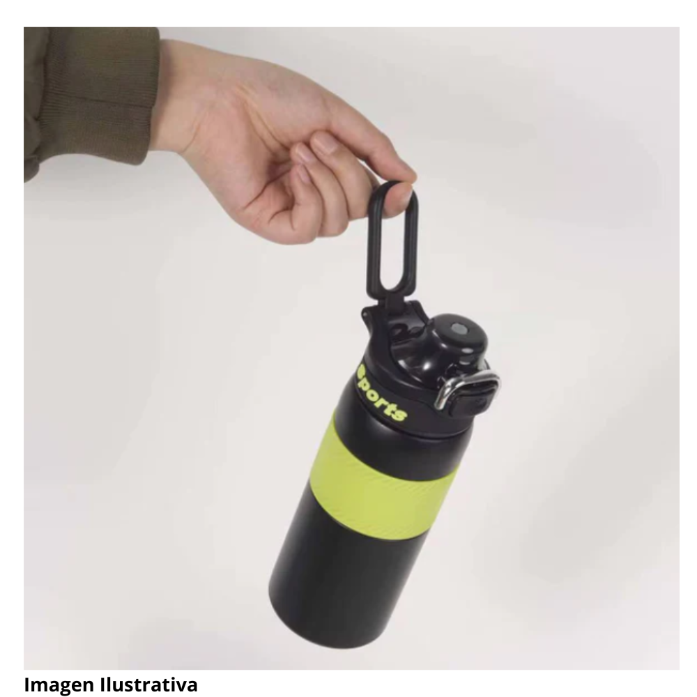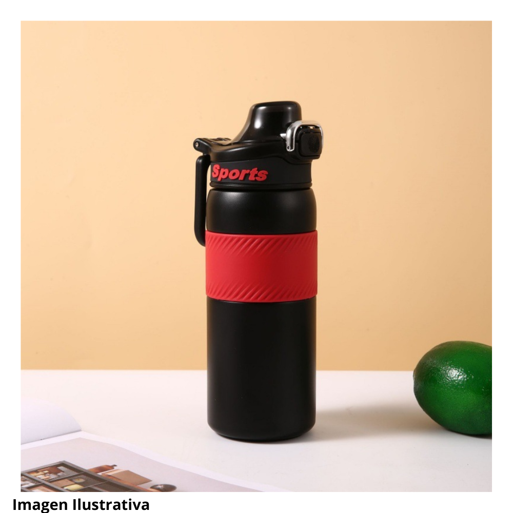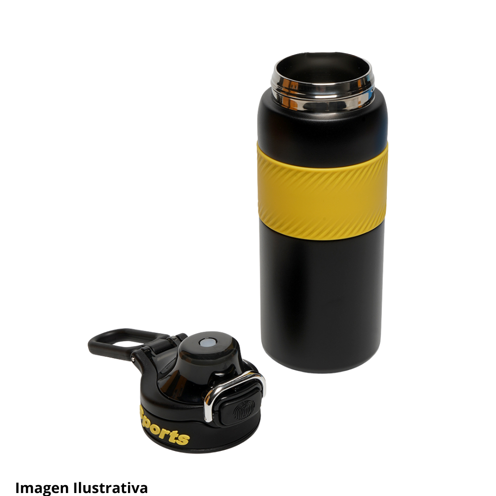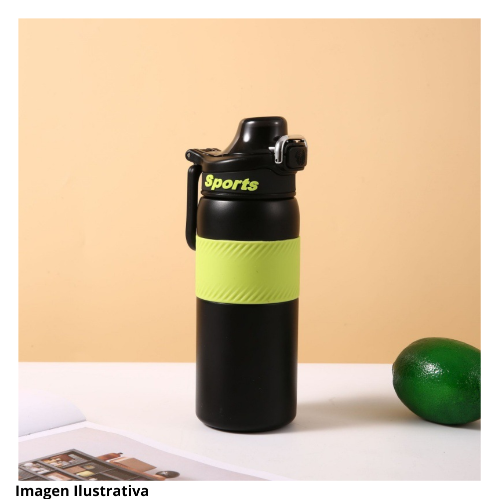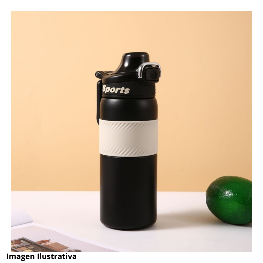 Este termo deportivo presenta un cuerpo robusto pensado para actividades fisicas y uso constante. En la zona central se observa una banda amplia con textura visible que facilita un agarre firme incluso en movimiento. La forma general del recipiente sugiere resistencia y comodidad para transportarlo en diversas rutinas de ejercicio.