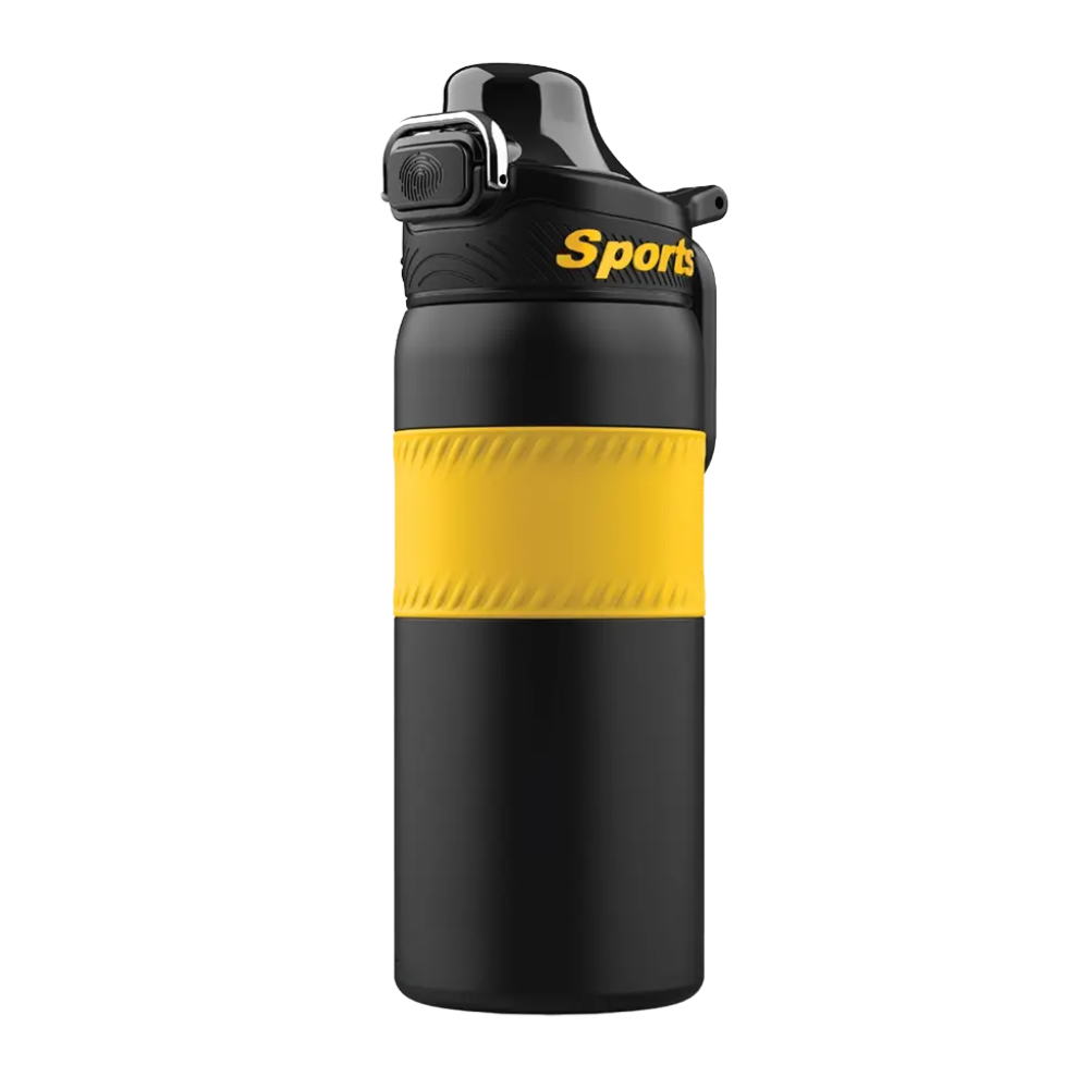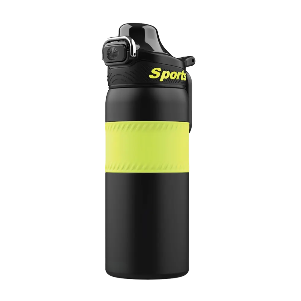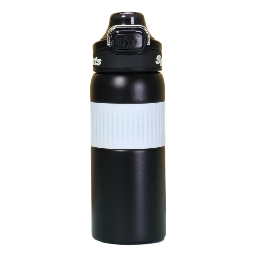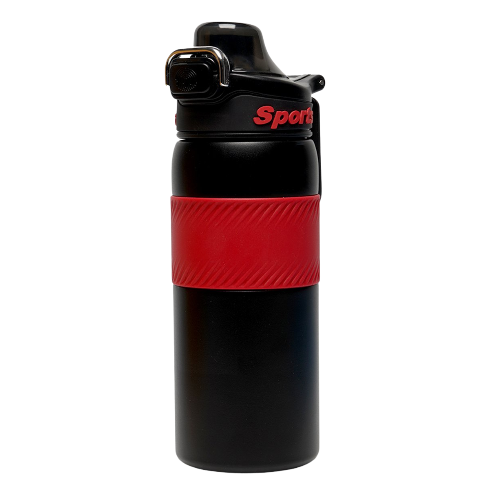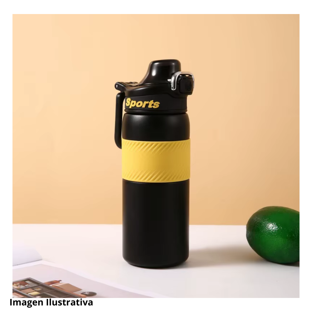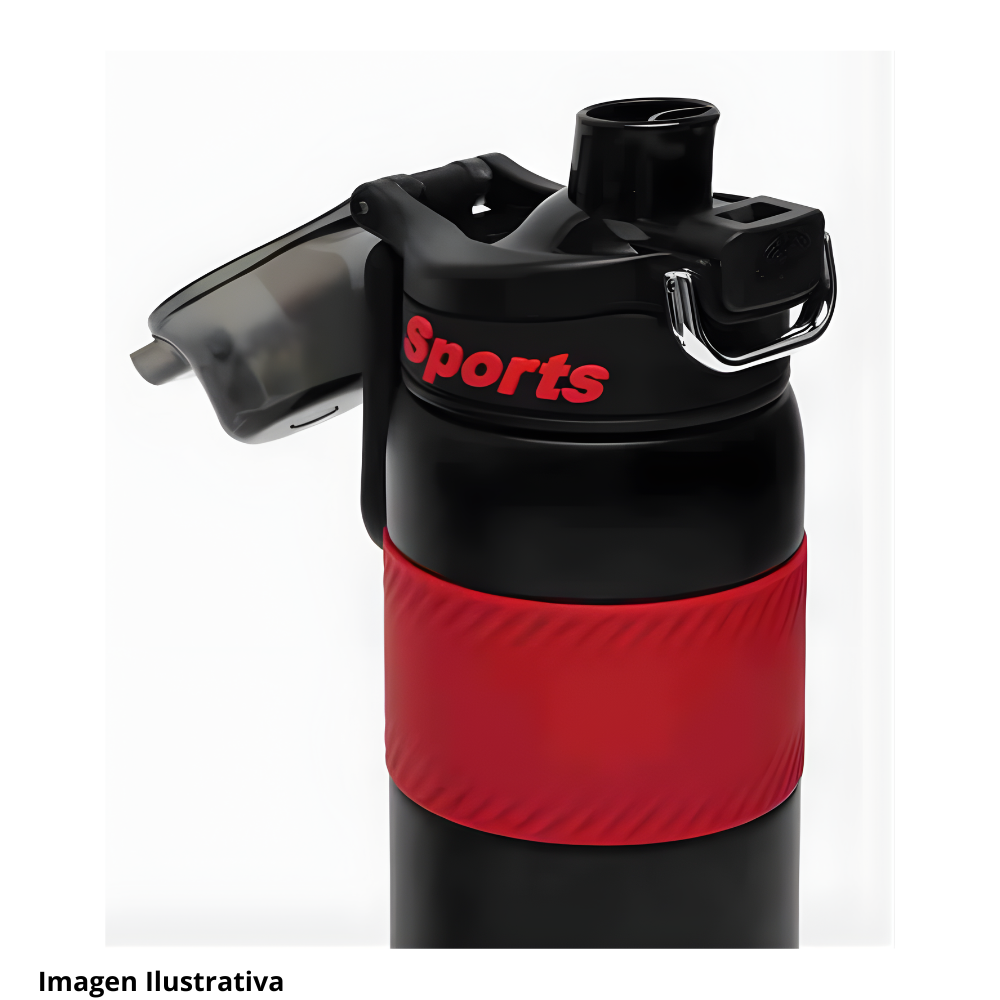 Este termo deportivo presenta un cuerpo robusto pensado para actividades fisicas y uso constante. En la zona central se observa una banda amplia con textura visible que facilita un agarre firme incluso en movimiento. La forma general del recipiente sugiere resistencia y comodidad para transportarlo en diversas rutinas de ejercicio.