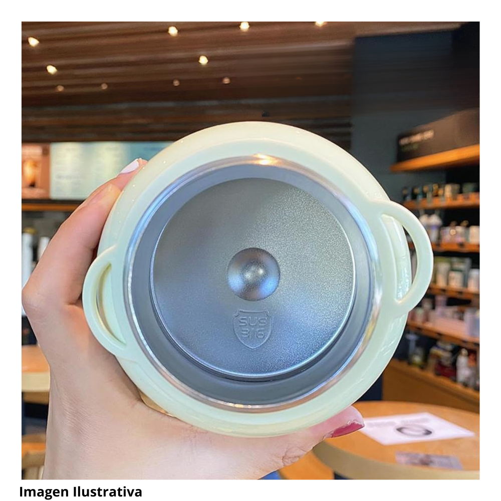 La tapa muestra un diseno con detalles visibles que asemejan orejas, lo cual aporta un estilo llamativo orientado al uso infantil. En la zona frontal destaca un seguro con forma circular acompañado de un boton central, indicando un mecanismo que permite abrir la tapa de manera controlada. Sobre la tapa tambien se aprecia un asa integrada que facilita transportar el termo con comodidad.